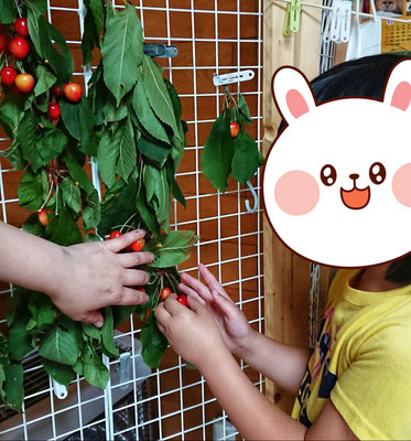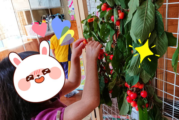 さくらんぼ狩りが出来なかった子の為に了承を得て枝ごと数本もらい、室内でのさくらんぼ狩りを楽しみました(^^)/